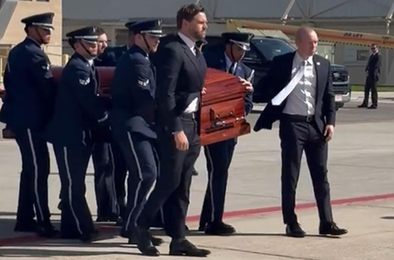 Towarzyszyli mu wojskowi, a na płycie lotniska obecna była żona Kirka, Erika Frantzve, która nie kryła łez. Drugą damę USA, Ushę Vance, można było zobaczyć trzymającą ją za rękę w geście solidarności.