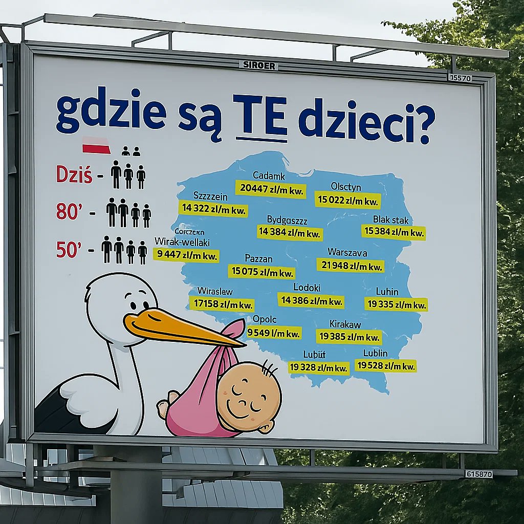 Grafika przedstawia billboard z hasłem „Gdzie są TE dzieci?”, które w swojej formie wizualnej i typografii jednoznacznie nawiązuje do słynnej kampanii Fundacji Mamy i Taty sprzed lat. Jednak tym razem przekaz jest przewrotny. Zamiast moralizującego tonu, pojawia się cicha, ale czytelna odpowiedź: na mapie nie ma dzieci, są ceny mieszkań.