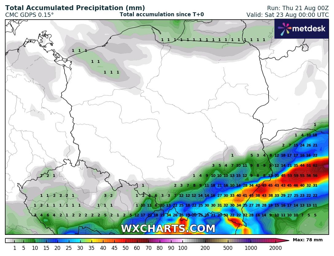 - Ostrzeżenie II stopnia obejmuje m.in. powiaty podkarpackie i małopolskie. Prognozuje się tam ulewne opady deszczu, miejscami przekraczające 40 mm, oraz burze z silnym wiatrem. Prawdopodobieństwo wystąpienia tych zjawisk wynosi 80%.