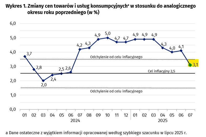 W lipcu 2025 roku inflacja w Polsce wyniosła 3,1% rok do roku, co oznacza spory spadek względem czerwca, kiedy to wynosiła 4,1%. To pierwszy raz od dłuższego czasu, gdy wskaźnik inflacji znalazł się w granicach celu Narodowego Banku Polskiego, który wynosi 2,5% plus minus jeden punkt procentowy.