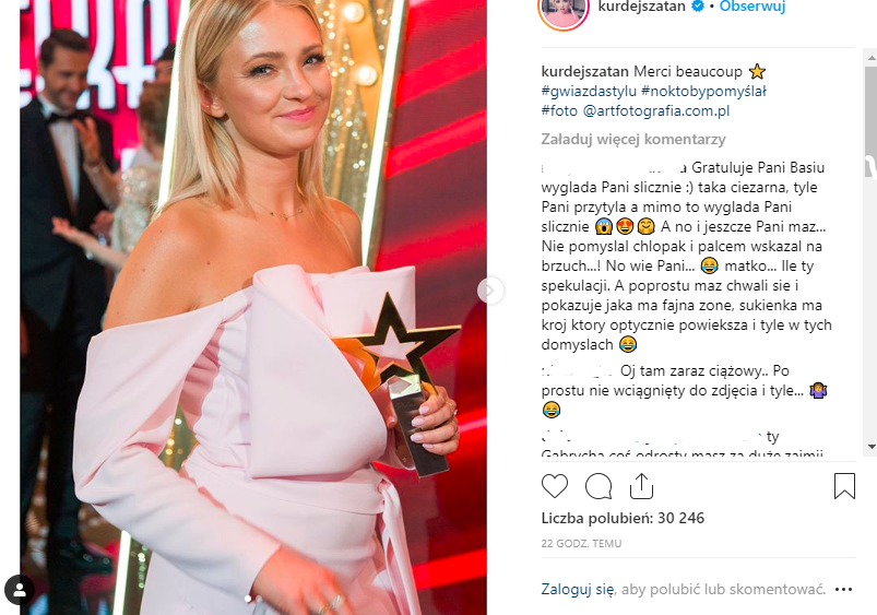 Obcisła sukienka uwydatniła zaokrąglony brzuch aktorki. Fani zaczęli snuć domysły, czy to efekt złej diety czy może aktorka zaszła w ciążę.  Barbara Kurdej-Szatan jest już mamą 7-letniej Hani. Wielokrotnie spekulowano nt. jej ciąży a sama zainteresowana wspominała, że planuje powiększenie rodziny. Z tego powodu chciała nawet odejść z serialu M jak Miłość.